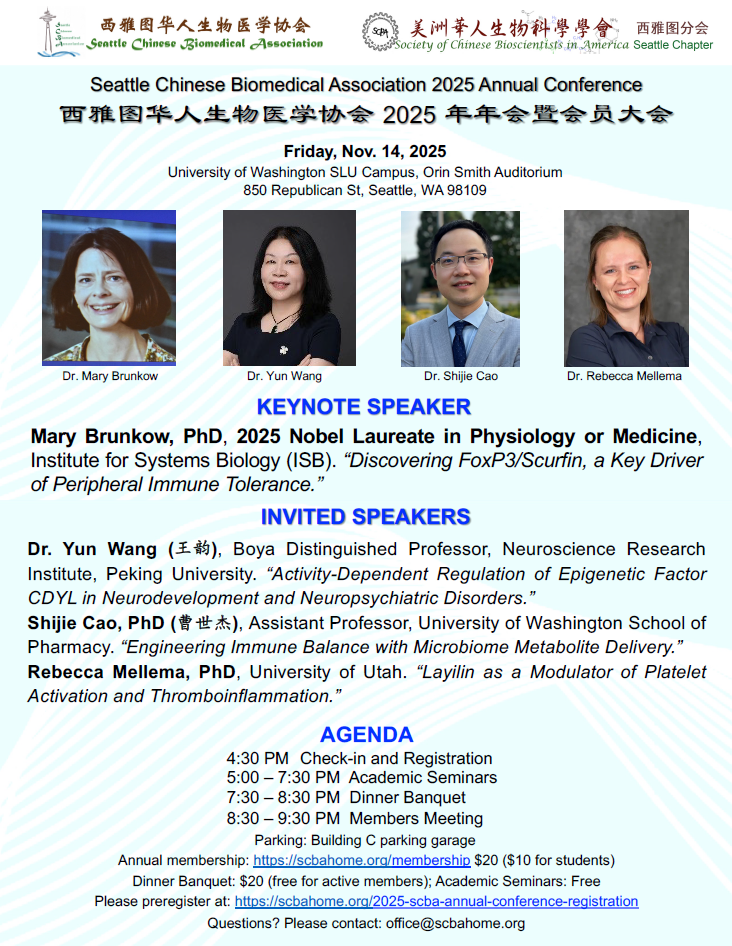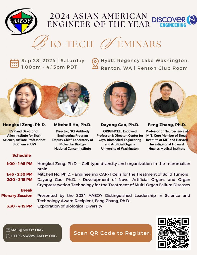 Seattle Chinese Biomedical Association (SCBA) is co-organizing a BioMed/BioTech/BioEng seminar session (please see below flyer) with the Chinese Institute of Engineers – Seattle Chapter (CIE-SEA) at 2024 AAEOY (Asia American Engineer of the Year) from 1 pm to 4:30 pm on Saturday, September 28th. We have lined up 4 outstanding speakers (3 current and 1 former AAEOY awardees) in the basic and clinical translational research fields, including Experts in Neuroscience, CAR-T Cells, Bioengineering, and Pioneer of the CRISPR-Cas9 genome editing technology.