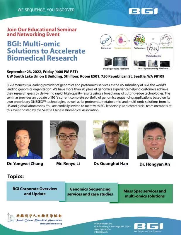 我们SCBA将于2022年9月23日周五下午4点钟联合美国华大基因BGI Americas举办一个华大基因产品和服务宣讲会。地点是在UW South Lake Union Campus, E building, 5th floor Conference Room E501 (Address: 750 Republican St, Seattle, WA 98109). 欢迎大家积极参会,届时华大基因将会提供简便晚餐:披萨和饮料。具体详情会在收到华大基因的宣传材料后发出。